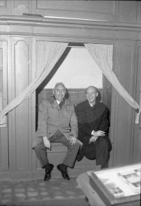 1853 Op maandag 31 october 1853 in de koornbeurs te Franeker wordt bij openbare verkoop te koop aangeboden door de gezamelijke erfgenamen van Oeke Adama, (namen niet ingevuld omdat het een zeer gecompliceerde zaak is en er ruim 20 personen met familie beschreven worden als erfgenamen plus de volledige inventaris van het perceel en de eigendommen van Oeke Adama beschreven worden, totaal dossier is 18 pagina’s. Een aantal erfgenamen zijn als wees inwonende bij Oeke Adama), een herenhuis met tuin en erf staande en gelegen aan de breedeplaats te Franeker in de wijk EW 1 Kad. Nr. Sectie A 702, bij mejuffrouw Oeke Adama bewoond en in gebruikt en met de dood ontruimt, begerechtigd met een stem in het sjaardemaleen en pro quota de zwanenjacht, op 8 december 1853 door de koper te aanvaarden, de koper zal de deur in de erfscheiding tussen dit en het volgende perceel mogen wegnemen, de spiegels in de schoorstenen van voor en tuinkamer, de kledingkasten in het portaal, de glazenkast in de kleine keuken, het kippenhok met de loop in de tuin worden niet mede verkocht, Ten 2de: een huis met wagenhuis en stalling, staande en gelegen naast het vorige perceel in de kerkstraat te Franeker, Kad. Nr. Sectie A 703, bij Coenraad Persch in gebruikt, op 12 mei 1854 te aanvaarden, de kopers van dit perceel zal de deur in de noorderlijke muur met het kozijn en raam weg moeten nemen en dichtmetselen, Ten 3de een tuin Kad. Nr. Sectie A 704 gelegen naast het 2de perceel, alsmede 4 graven op de begraafplaats buiten Franeker Kad. Nr. Sectie B 196, in vak A zijnde de nr. 95 en 97 en in vak B de nr. 218 en 219, de kosten bij deze verkoping als kamerhuur en verteringen, oproepen, zegels en billetten, redistratierechten en proces verbaal komen voor de koper, de hoed en noed gaan dadelijk na de finale toewijzing over op de koper, het geveilde wordt verkocht zo goed en kwaad het is met lusten en lasten, sevituten, gerechtig en mandeligheden daartoe en aan behorende, de heg tot scheiding tussen het 1ste en 2de perceel staande behoort bij het 1ste perceel, de koper zal de opening ontstaan door het wegnemen van de deur moeten dichtmaken hetzij door het planten van bomen en is gerechtigd de heg weg te nemen en een stek of muur voor zijn rekening te laten maken en te onderhouden, de bewoners van het 2de perceel zullen tot 12 mei 1854 de vrijheid hebben de voor hun gezin benodigde regenwater te halen uit de regenbal behorende bij het 1ste perceel, de muur aan de noordzijde van het 1ste perceel is eigendom van de stad Franeker, de koper zal verplicht zijn bij iedere oproeping van de collatoren van het sjaardemaleen een procuratie af te geven op zodanige persoon als welke hem door de uitvoerders der uiterste wilsbeschikking van de erflaterse Mejuffrouw Oeke Adama zal worden opgegeven ten einde bij die oproepingen al dat gene te verrichten wat de koper alsmede de collatoren zouden kunnen doen zonder enige beperking of speciaal beding, doch alleen tot zolang als een zoon van den heer Anastasius Josephus Bruinsma, zonder beroep, wonende te Leeuwarden met een gedeelte van het leen zal zijn begiftigd, het eerste bod op het 1ste perceel wordt gedaan door Frans Schaafsma zonder beroep wonende te Franeker met fl. 3363,- het bod op het 2de perceel wordt gedaan door Jozef Tombrock koopman wonende te Franeker met fl. 585,- Op maandag 14 november 1853 in het logement van der Pol te Franeker wordt het bod op het 1ste perceel verhoogt naar fl. 3963,- het bod op het 2de perceel wordt verhoogt naar fl. 718.- tezamen fl. 4681,- waarop Philippus Roorda bakker te Franeker het bod verhoogt met fl. 390,- wat door de notaris Gijsbertus Schot weer verhoogt wordt met fl. 900,- tezamen nu fl 5971,- te betalen in termijnen vanaf 1 januari 1854 in nederlandsche gulden en klinkende en alhier goed gangbare munt en geenzins met voor geld gaande papieren of effecten.