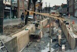 Franeker Zakenbeurs, met rechts een tent met een waterorgel, een jeugdkorps en markt. Hommema 6x6 negatief