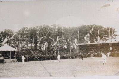 F2 feesten: 750 jaar stadsrechten voor Franeker. Er stond en tent op het Sjûkelân tijdens de zakenbeurs. Hier lopen verklede kinderen in een optocht.