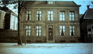 Inmetselen van een gedenksteen in de Doopgezinde vermaning. Het gebouw stond achter de verzamelplaats van melkboeren aan de Hofstraat, maar hoorde bij de Voors...