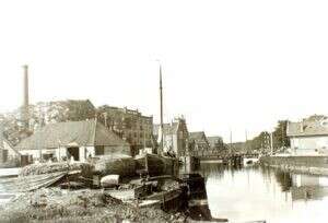 Een baggerboot die zand opspuit om het oude kanaal te dempen.