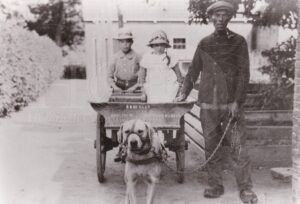 1961, Slagers Piet en Johannes Terpstra met Slagersknecht Geert van der Laan (Links)