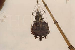 Het omtrekken van de spits tijdens de afbraak van Rooms Katholiek kerk