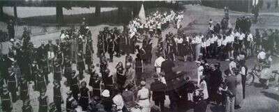 Feest. De Spaanse lijfwacht staat opgesteld voor de optocht. Landbouw tentoonstelling te Franeker. Op dinsdag 10 en woensdag 11 Juli 1906. Ter eere hiervan werd...