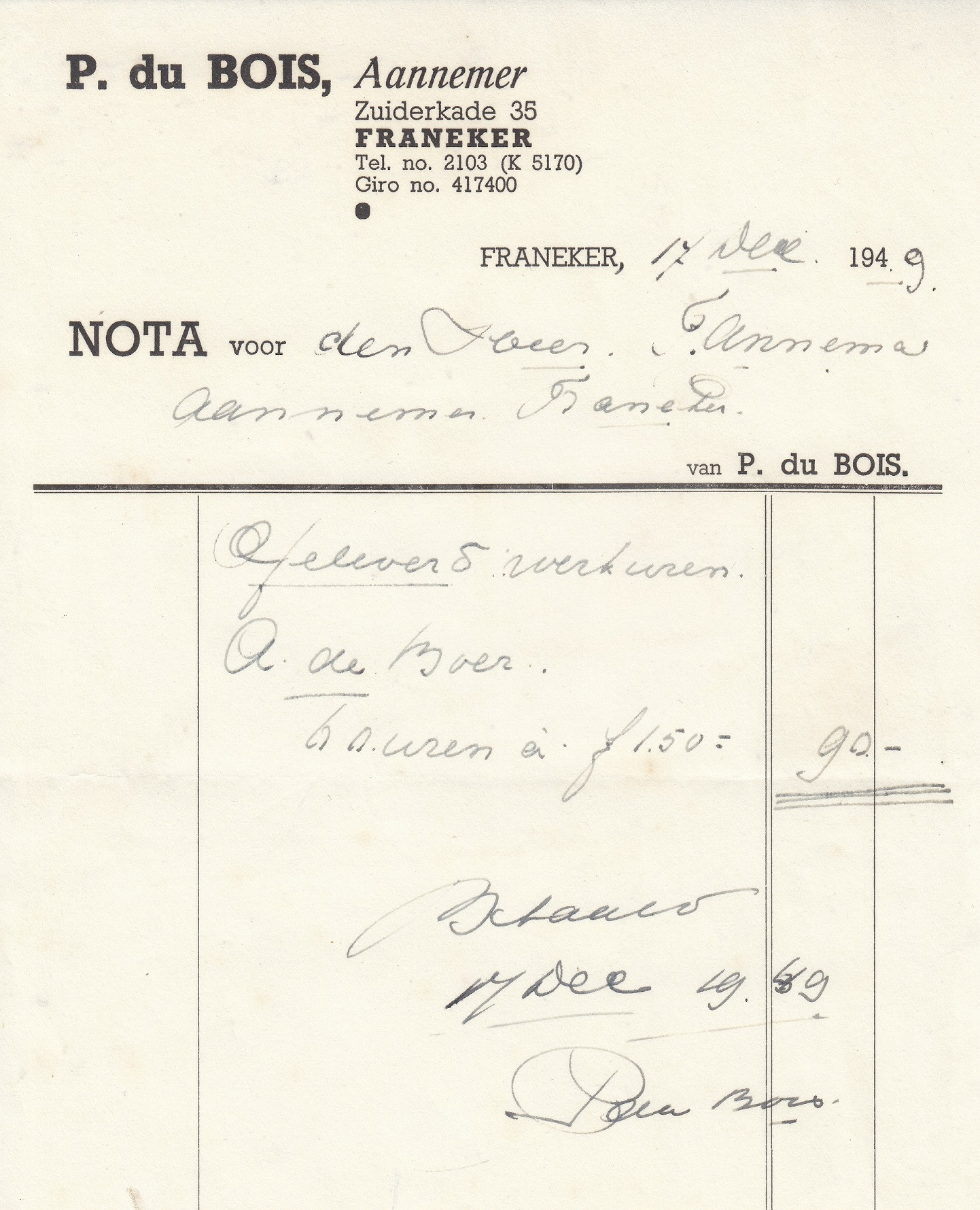 Beschrijving: | Pieter du Bois, aannemer Zuiderkade 35. Nota voor werkuren van A. de Boer. |