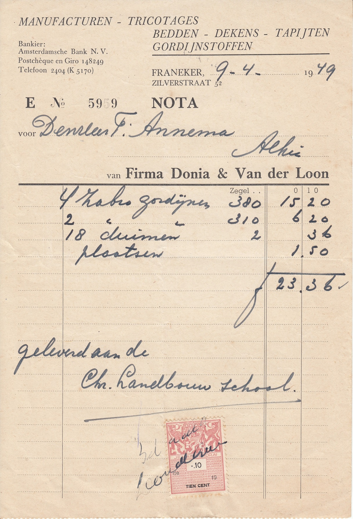 Beschrijving: | Donia & Van der Loon - Zilverstraat 52 (manufacturen, bedden, gordijnen). Nota voor de levering van gordijnen aan de Chr. Lanfbouwschool. |