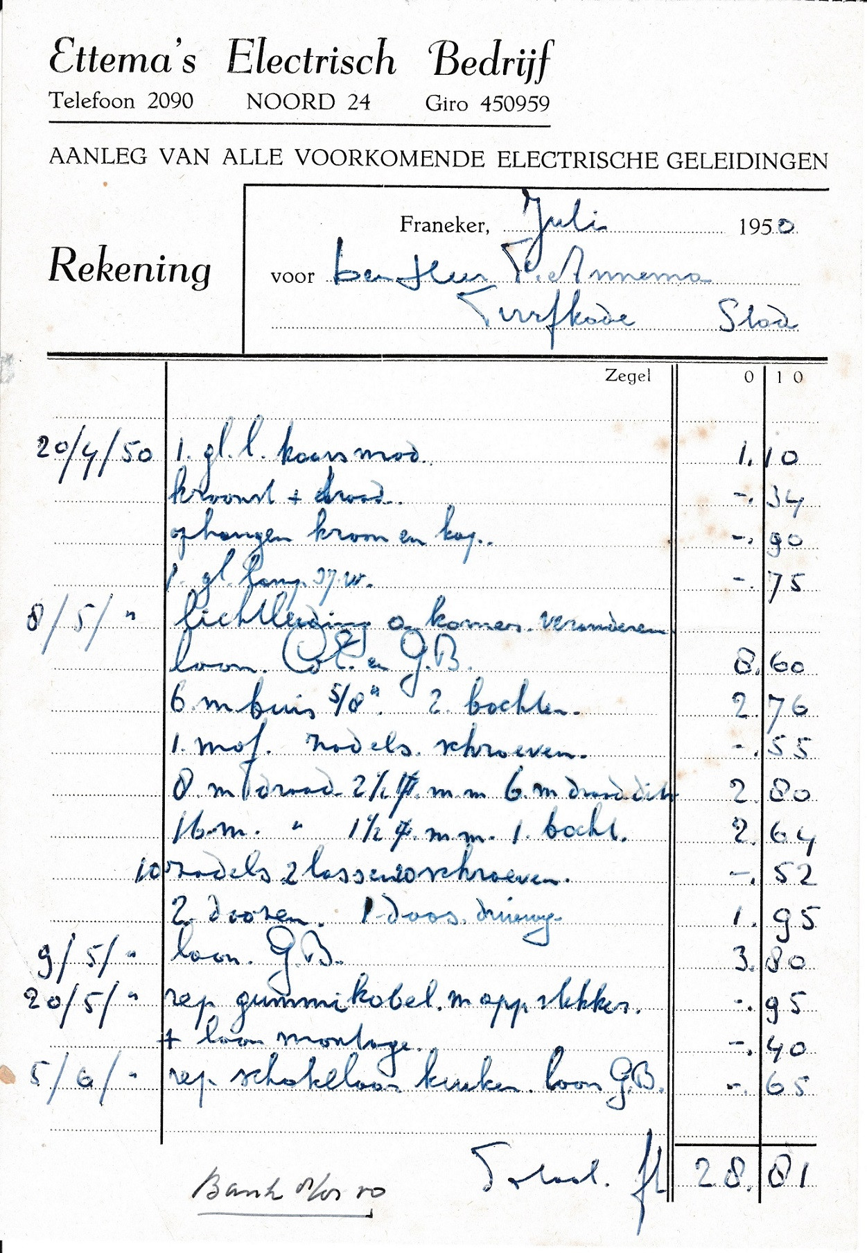 Beschrijving: | Ettema's Electrisch Bedrijf Noord 24. Rekening voor kleinmateriaal |