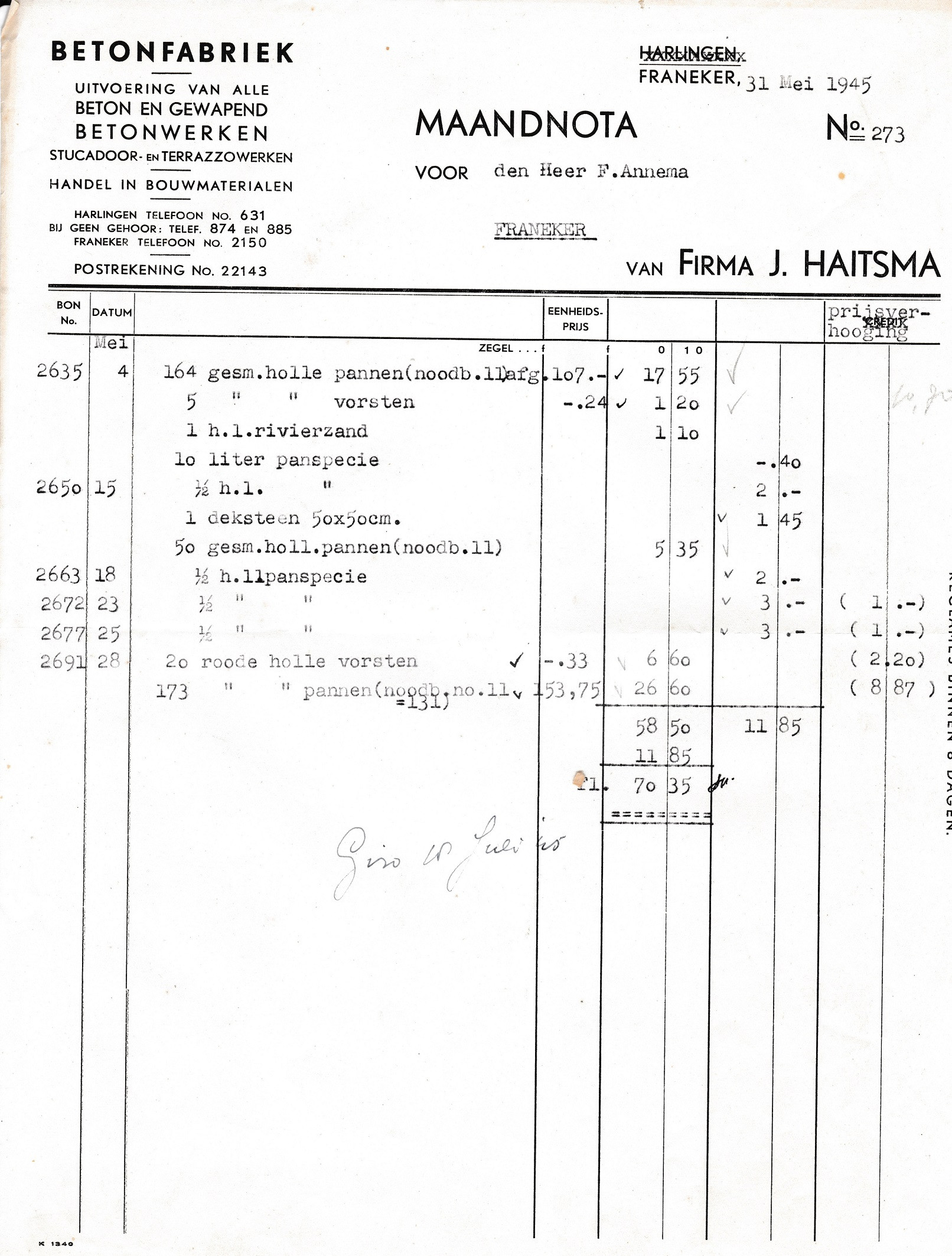 Beschrijving: | Maandnota van Haitsma Beton voor de levering van verschillende dakpannen ter herstel van de schade als gevolg van het opblazen van Saaksta's brug op zondag 5 mei 1945. ( Noodbevel 11 ) |