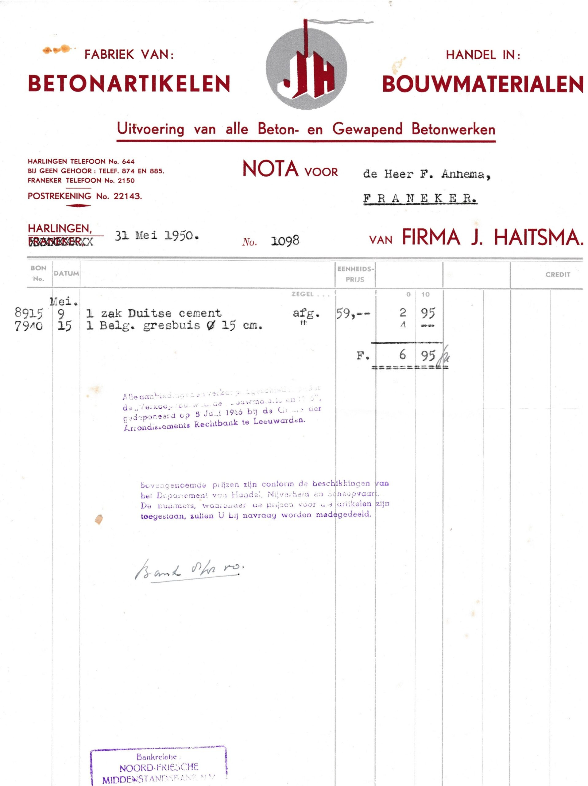 Beschrijving: | Nota van Haitsma Beton voor de levering van Duits cement en Belgisch gresbuis. |