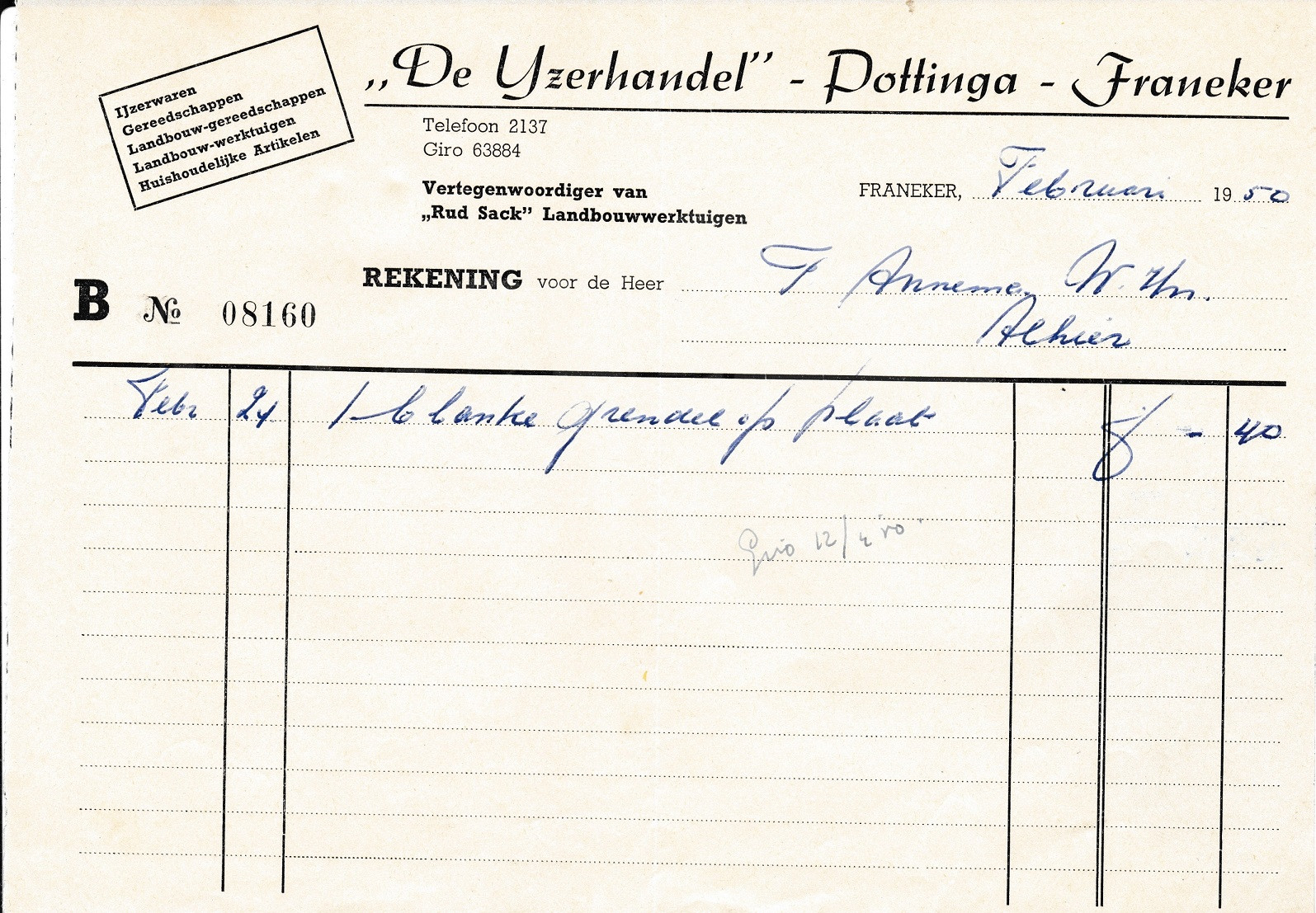 Beschrijving: | Pottinga "De IJzerhandel,, Voorstraat 82. Rekening voor een blanke grendel op plaat. |
