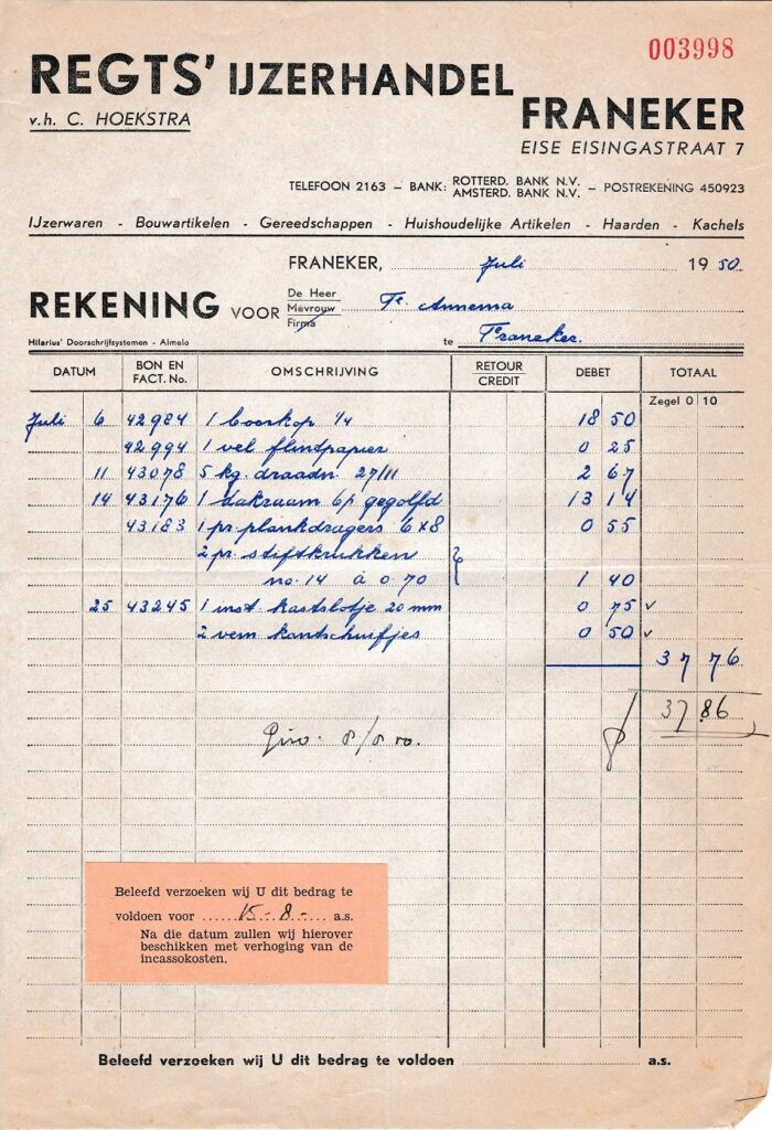 Beschrijving: | Regts ijzerhandel Eise Eisingstraat 7. Rekening voor o.a een dakraam en een boorkop. |