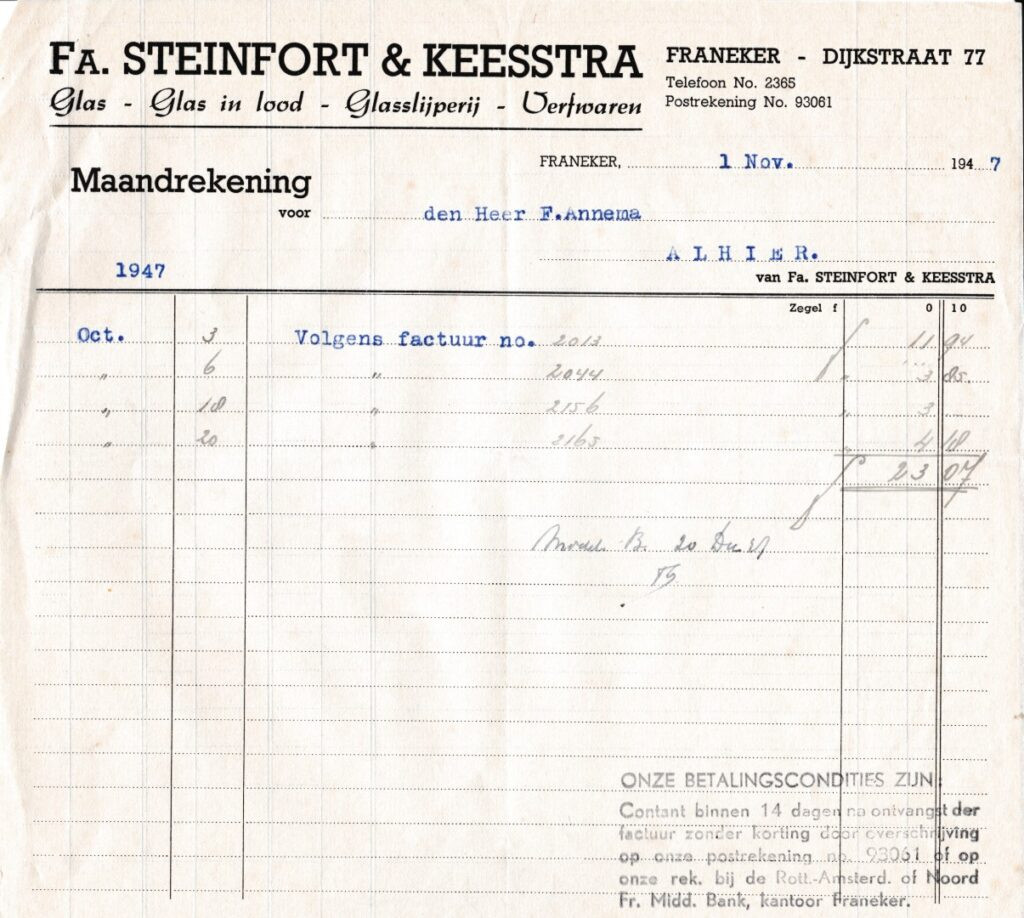 | Beschrijving: | Factuur van Steinfort & Keestra voor Foppe Annema ( Maandrekening ) |
