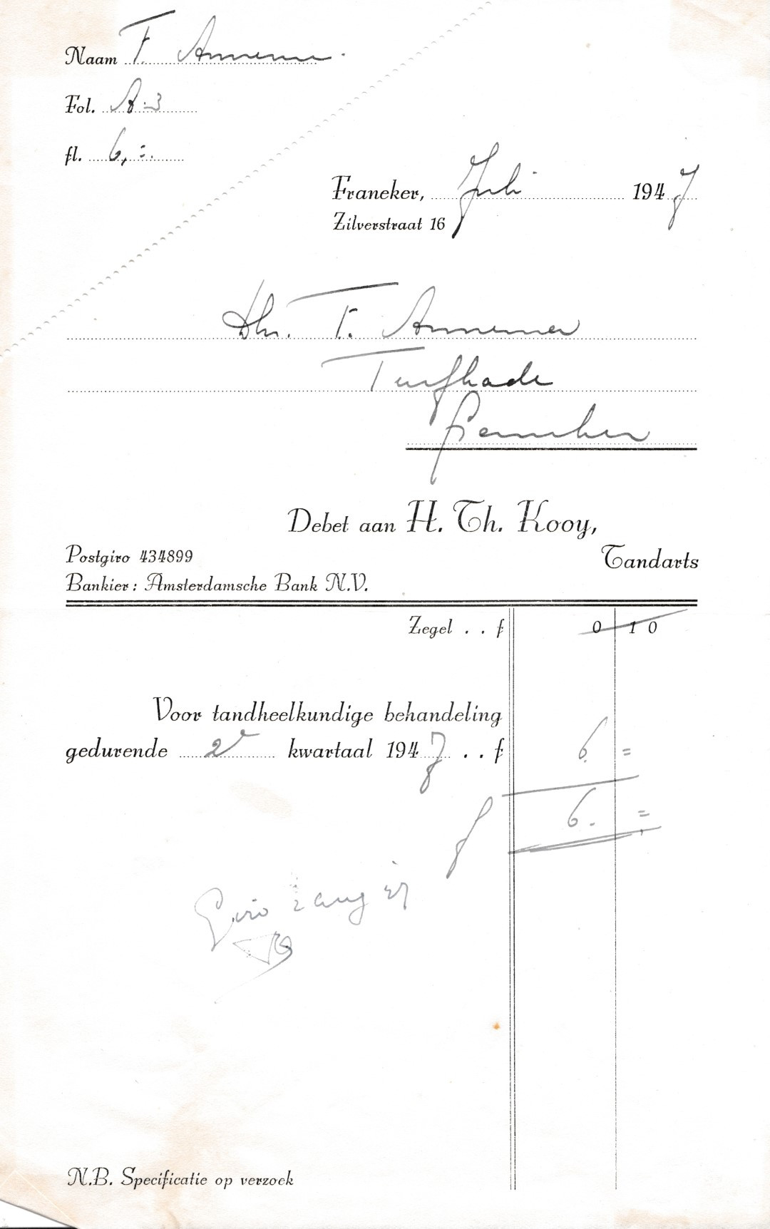 | Beschrijving: | Factuur van Tandarts Huibert Thomas Kooy voor Foppe Annema |