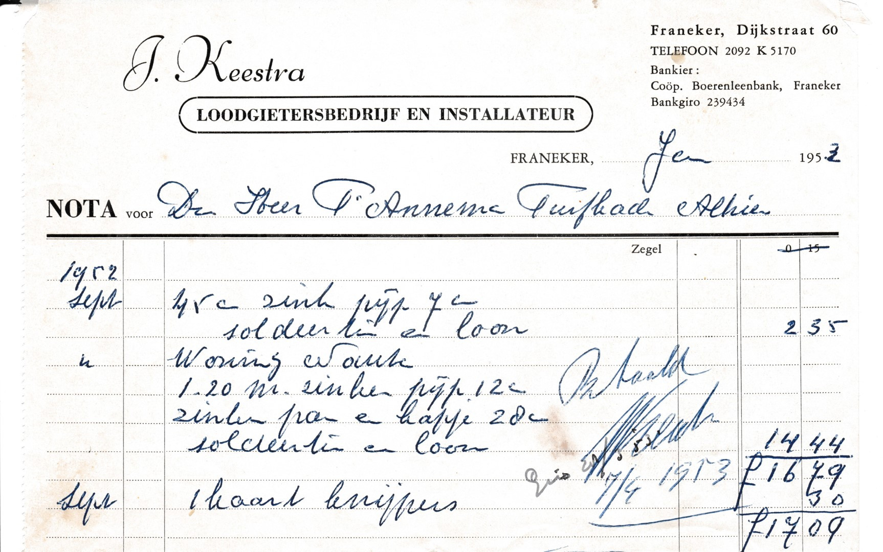 | Beschrijving: | Factuur voor zinkwerk van J. Keestra voor Foppe Annema |