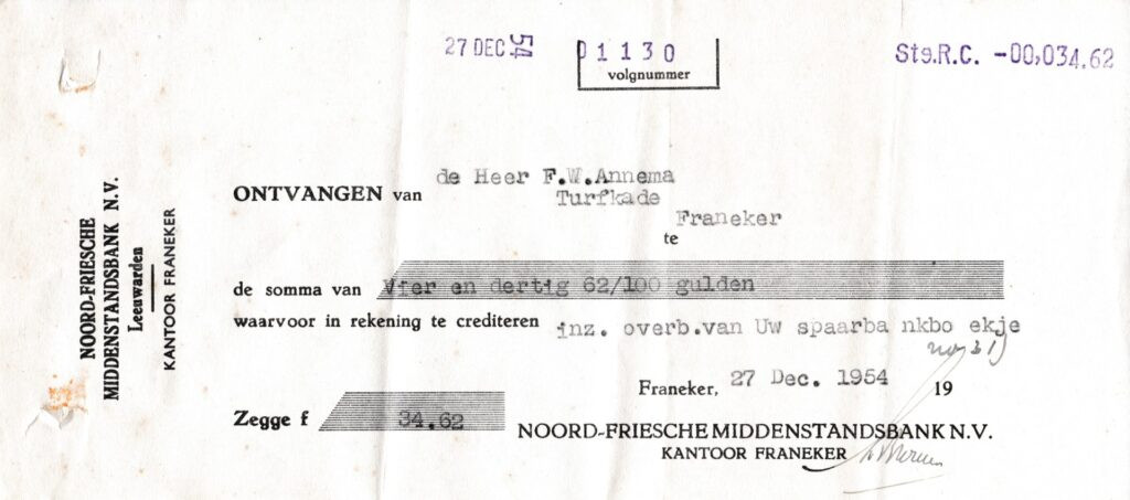 | Beschrijving: | Overboeking van Foppe Willems Annema van het spaarboekje van de Noord-Friesche Middenstandsbank N.V. |