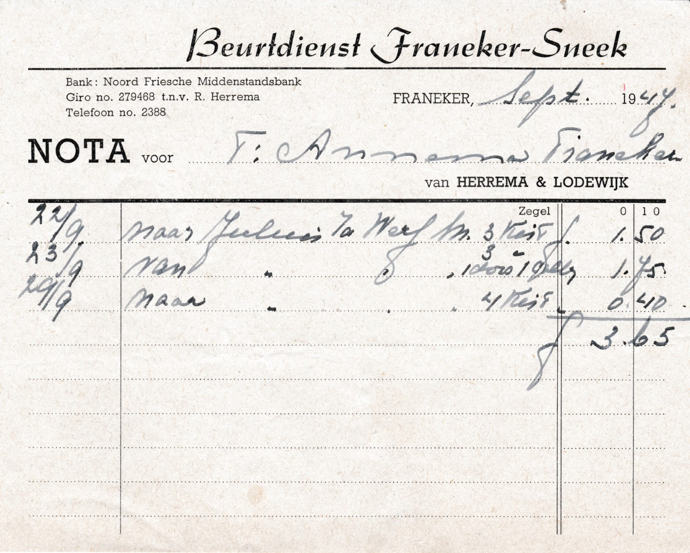 | Beschrijving: | Factuur van Beurtdienst Franeker- Sneek voor vervoer van goederen van Foppe Annema naar naar Julis van der Werf. |