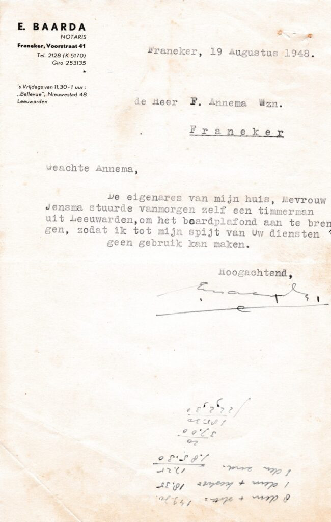 | Beschrijving: | Bericht van Notaris E. Baarda aan Foppe Willems Annema dat zijn diensten niet meer nodig zijn |
