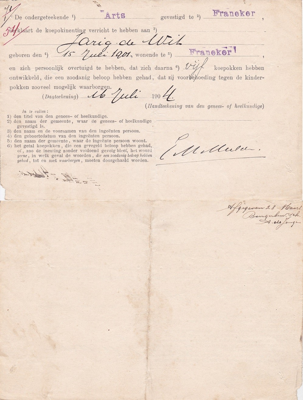 Beschrijving: | Medische gegevens. Koepokken vaccinatie: Jarig Lourentius de Wit, geboren 5 Juli 1901 te Franeker, wonende te Franeker. Ingeënt. 5 Koepokken zijn opgekomen. Arts: Edsge Martens Mulder. |