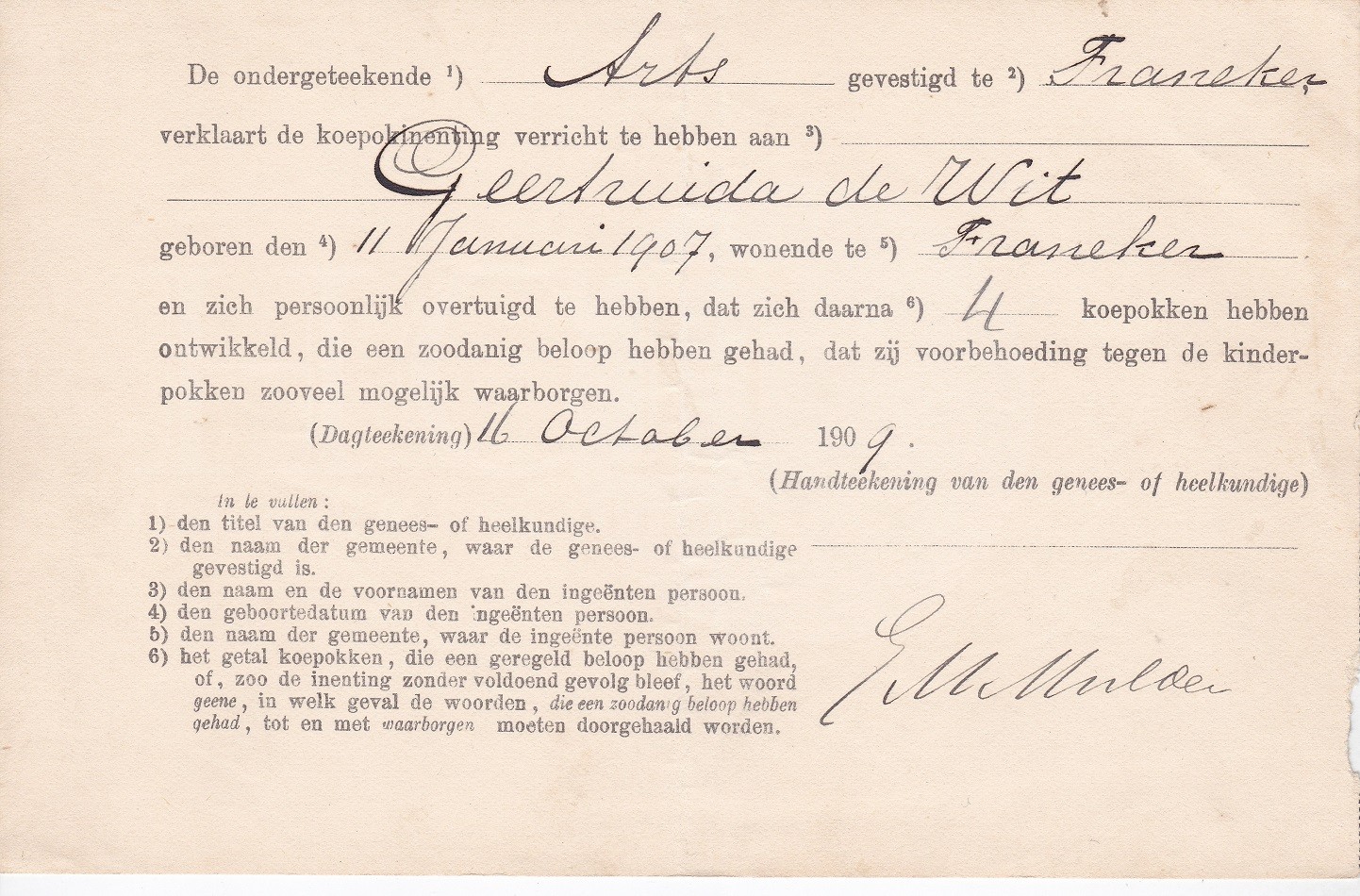 Beschrijving: | Medische gegevens. Koepokken vaccinatie: Geertruida Lourentius de Wit, geboren 11 Januari 1907 te Franeker, wonende te Franeker. Ingeënt. 4 Koepokken zijn opgekomen. Arts: Edsge Martens Mulder. |