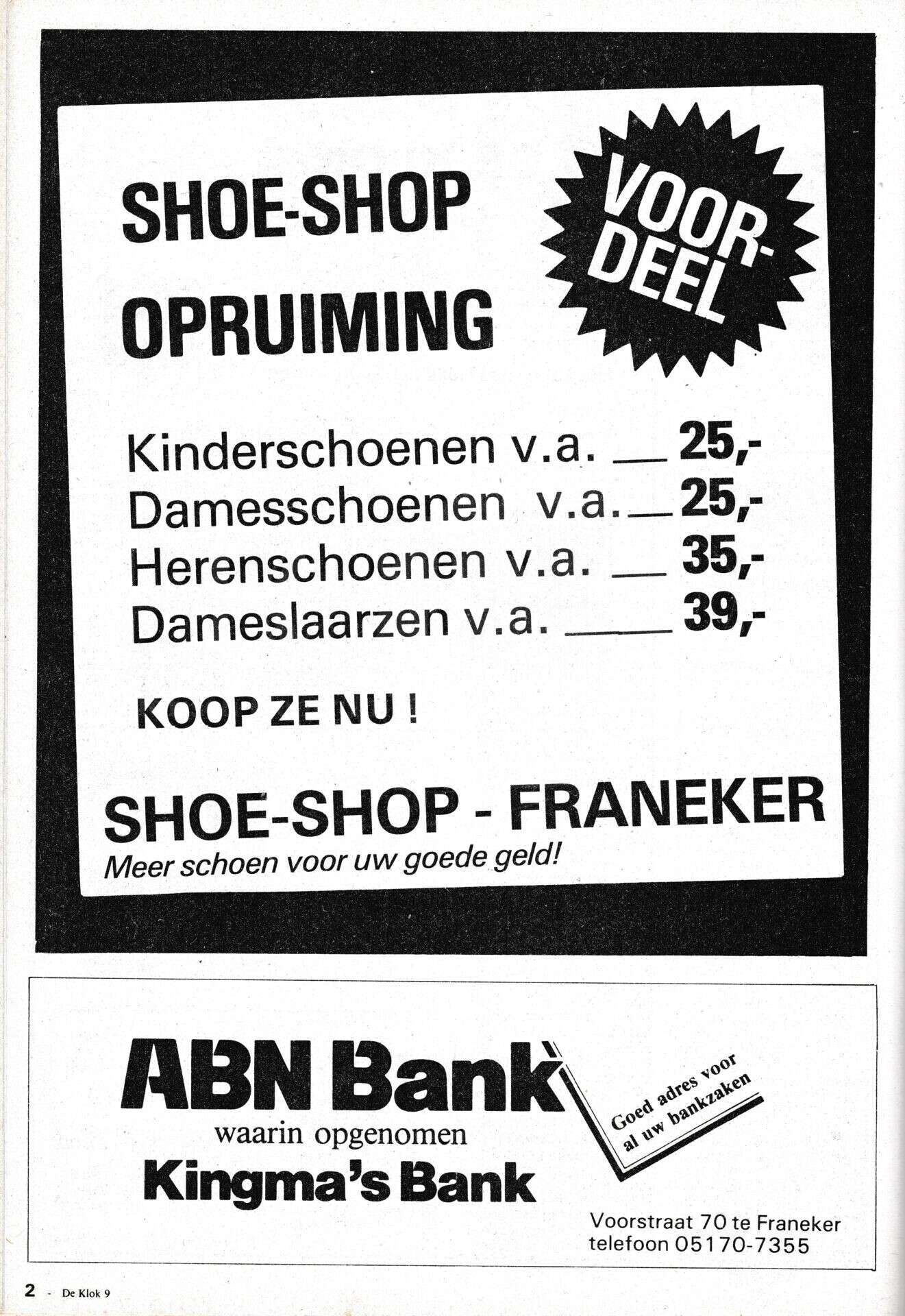 Beschrijving:Uitgave van de Klok December 1983, nummer 19, pagina 2: Advertentie: Shoe Shop schoenen, ABN Bank (Kingma's bank)
