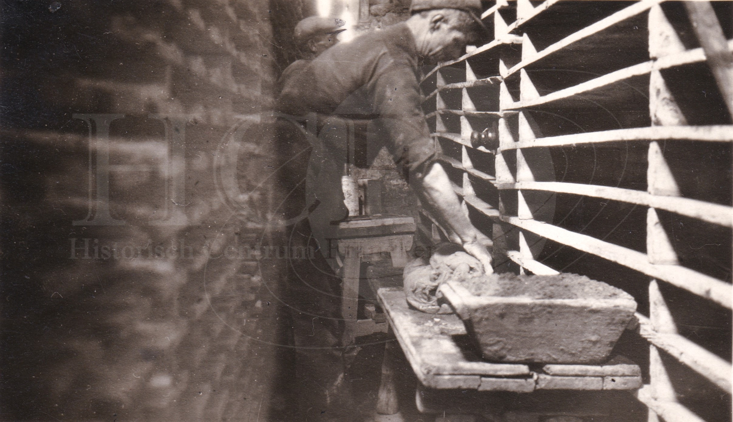 Beschrijving:Twee arbeiders zijn aan het werk op het Panwerk (Dakpan fabriek ) van Fortuin. Kneden van de klei voordat het in een mal word gedrukt.