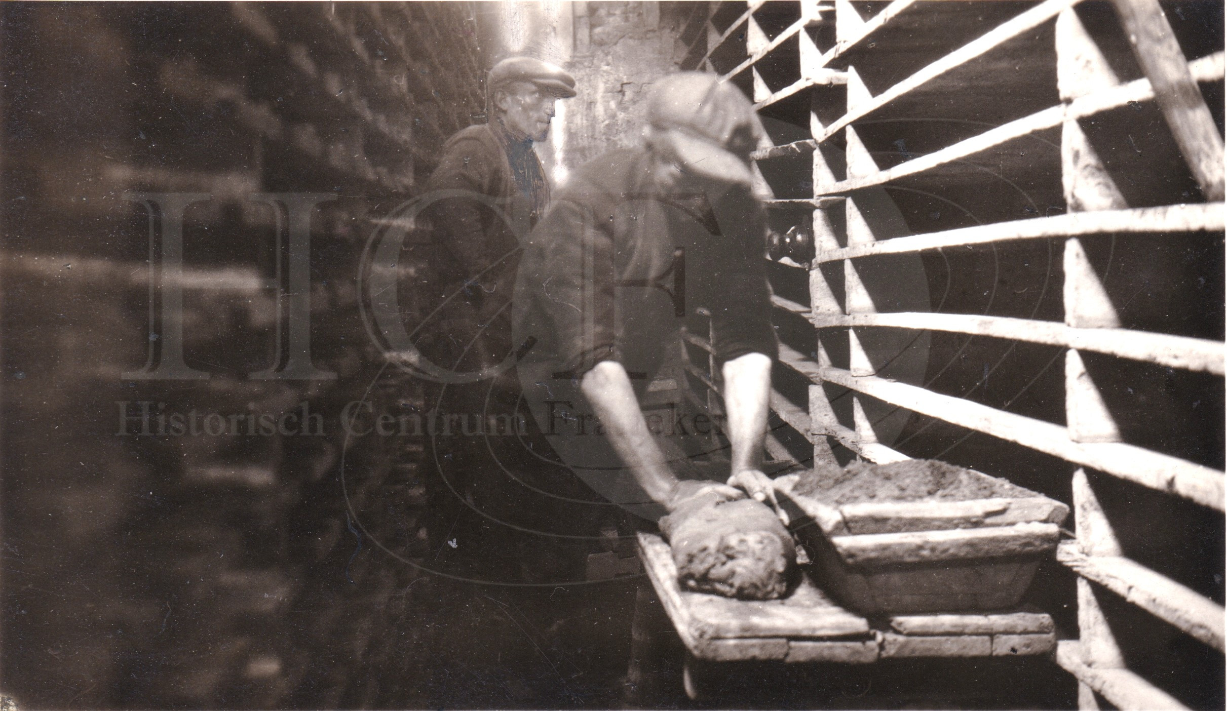 | Beschrijving: | Twee arbeiders zijn aan het werk op het Panwerk (Dakpan fabriek ) van Fortuin. Kneden van de klei voordat het in een mal word gedrukt. |
