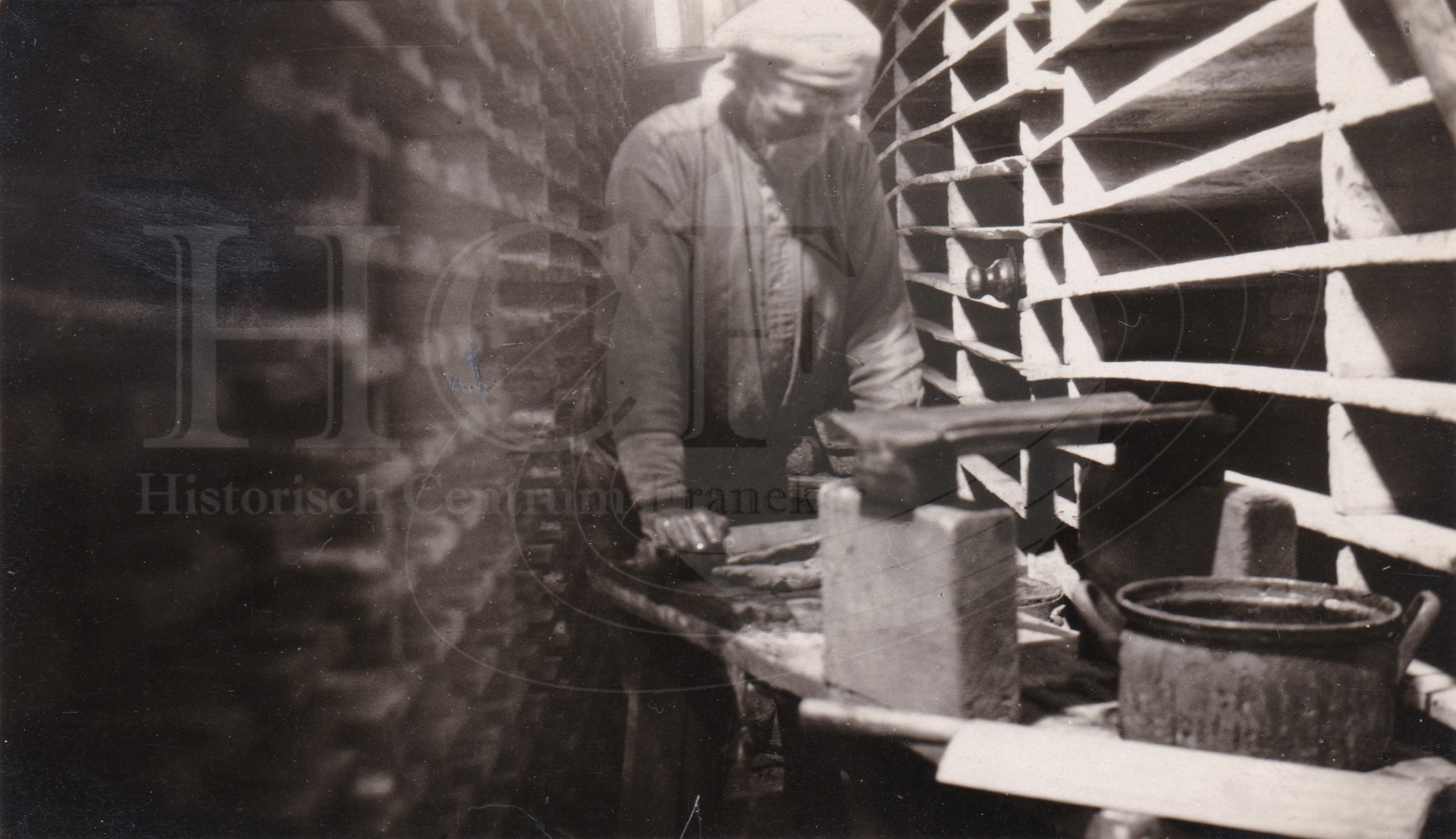 | Beschrijving: | Een arbeider is aan het werk op het Panwerk (Dakpan fabriek ) van Fortuin. Het uitrollen van de klei voordat het in een mal word gedrukt. |