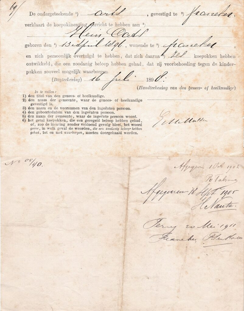 | Beschrijving: | Koepokken bewijs van Hein Cats, geboren 13-06-1896 |
