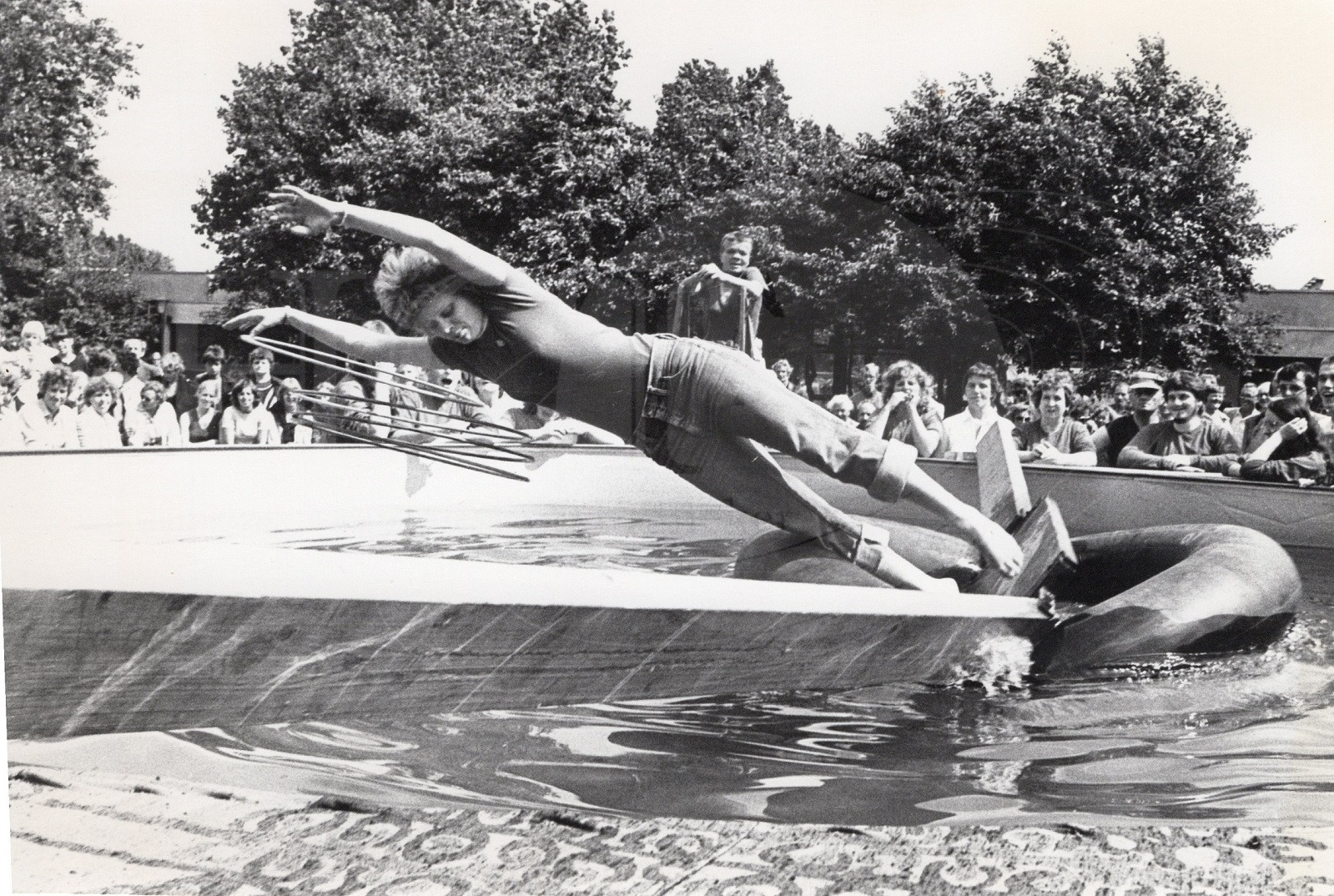 Beschrijving:Tuinfeest. PZ. Lopen over een plank over het water