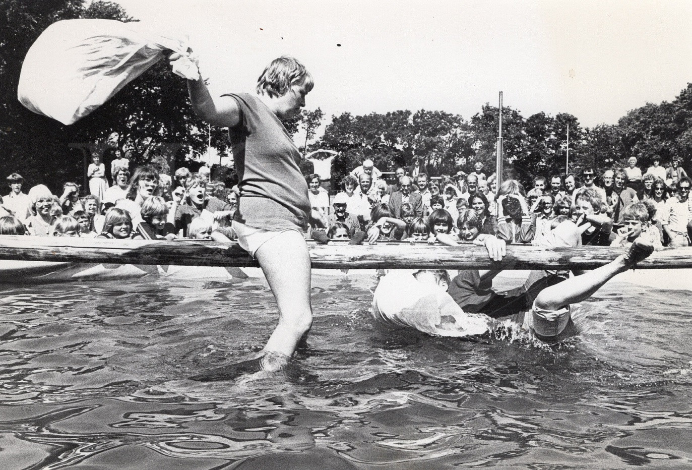 | Beschrijving: | Tuinfeest. PZ. Kussengevecht op een balk boven het water. |