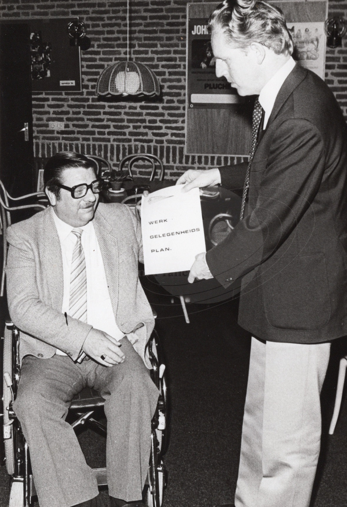 Beschrijving:Burgemeester Oldenziel overhandigd een werkgelegenheidplan aan een man in een rolstoel.