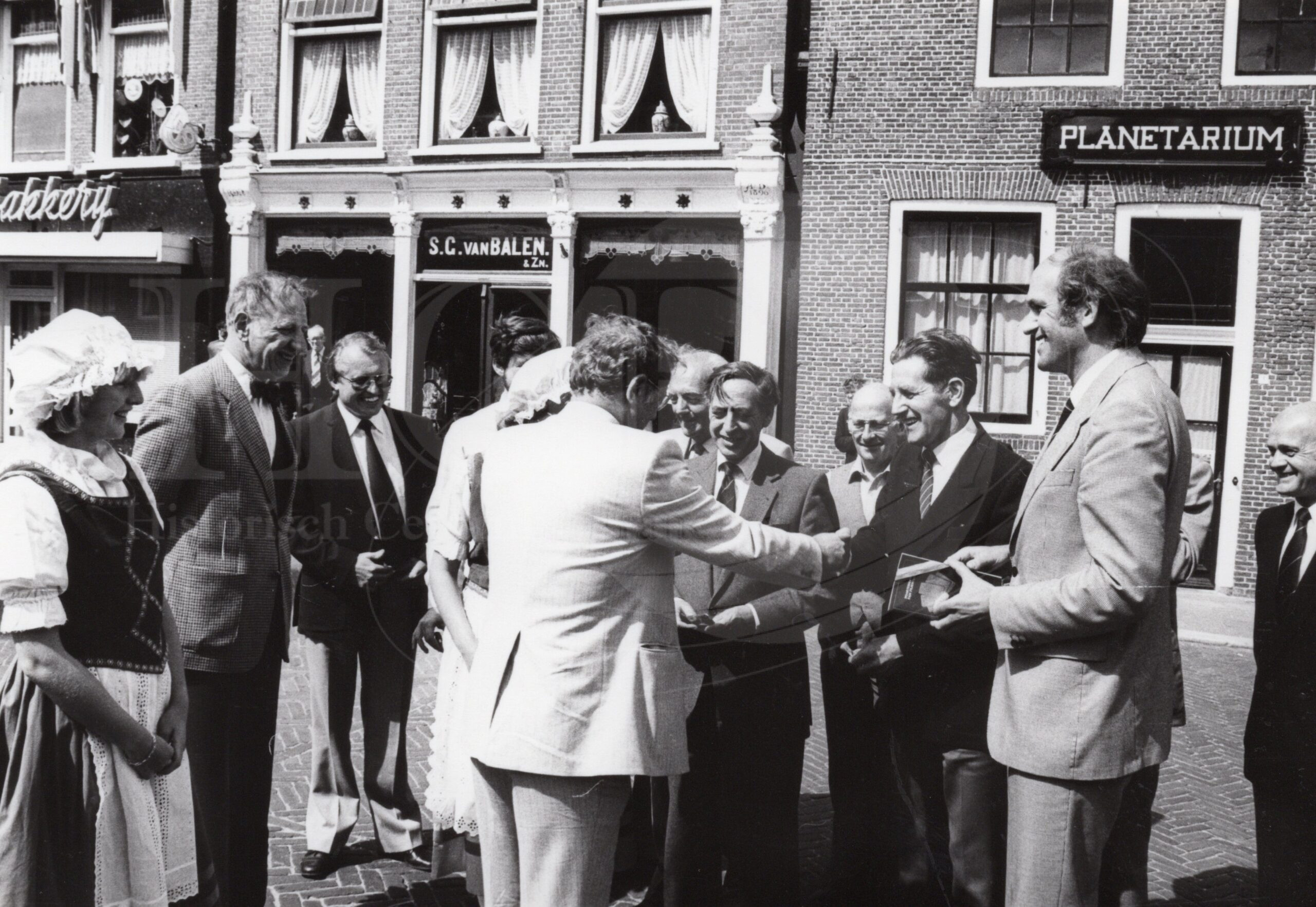 Beschrijving:Burgemeester Jaap Pop, ( Alphen aan den Rijn, 23 juni 1941 – Haarlem, 6 januari 2026) ( Burgemeester Franeker 1975- 1981) met verschilende mannen die elkaar de handens schuden.