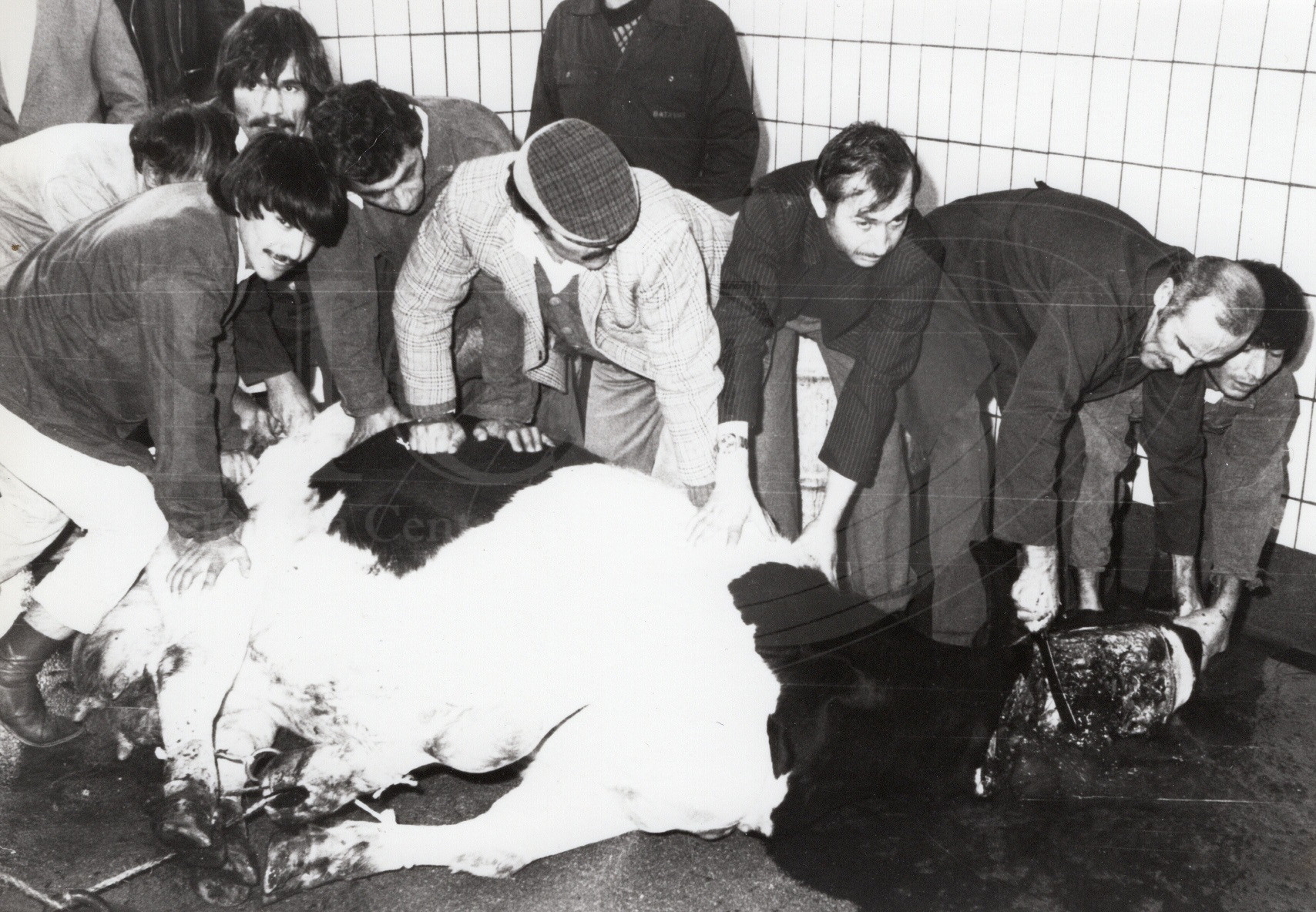 Beschrijving:Ritueel slachten van een koe door Moslims in de Noodslachting