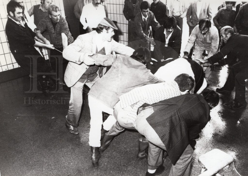 | Beschrijving: | Ritueel slachten van een koe door Moslims in de Noodslachting. Slachter Dijkstra assisteert. |