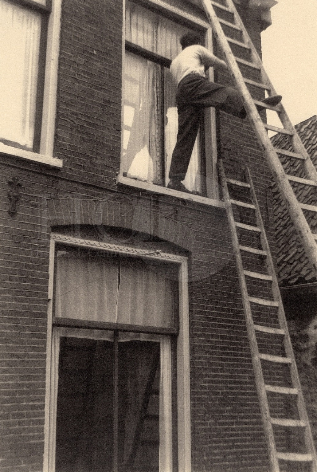 | Beschrijving: | Auke Kortrijk op een ladder. Zeer waarschijnlijk achterzijde Godsacker 34 |