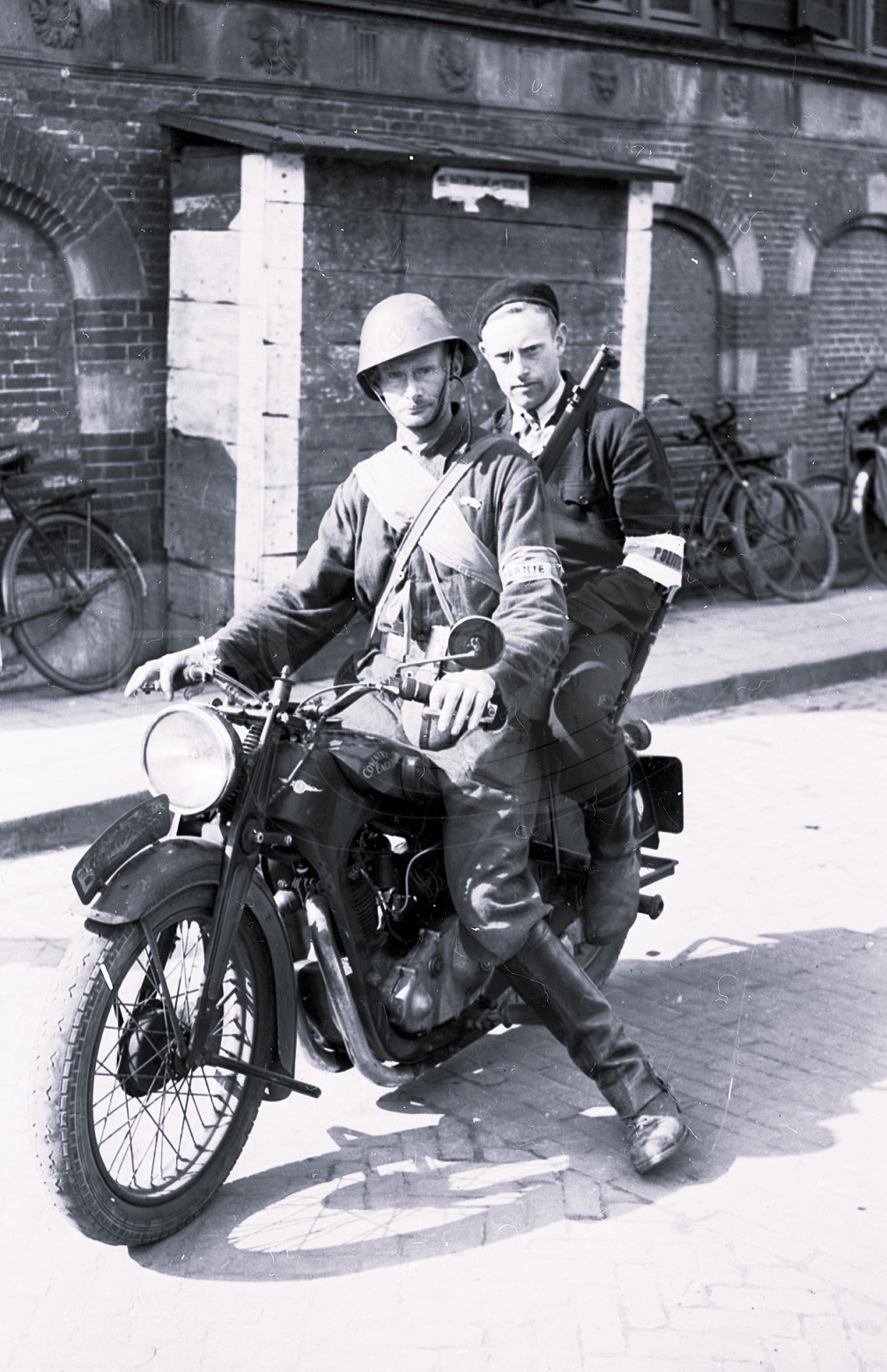 Beschrijving:P. Klijnsma, alias "Tito" met zijn zoon Jan op een 'Coventry Eagle'