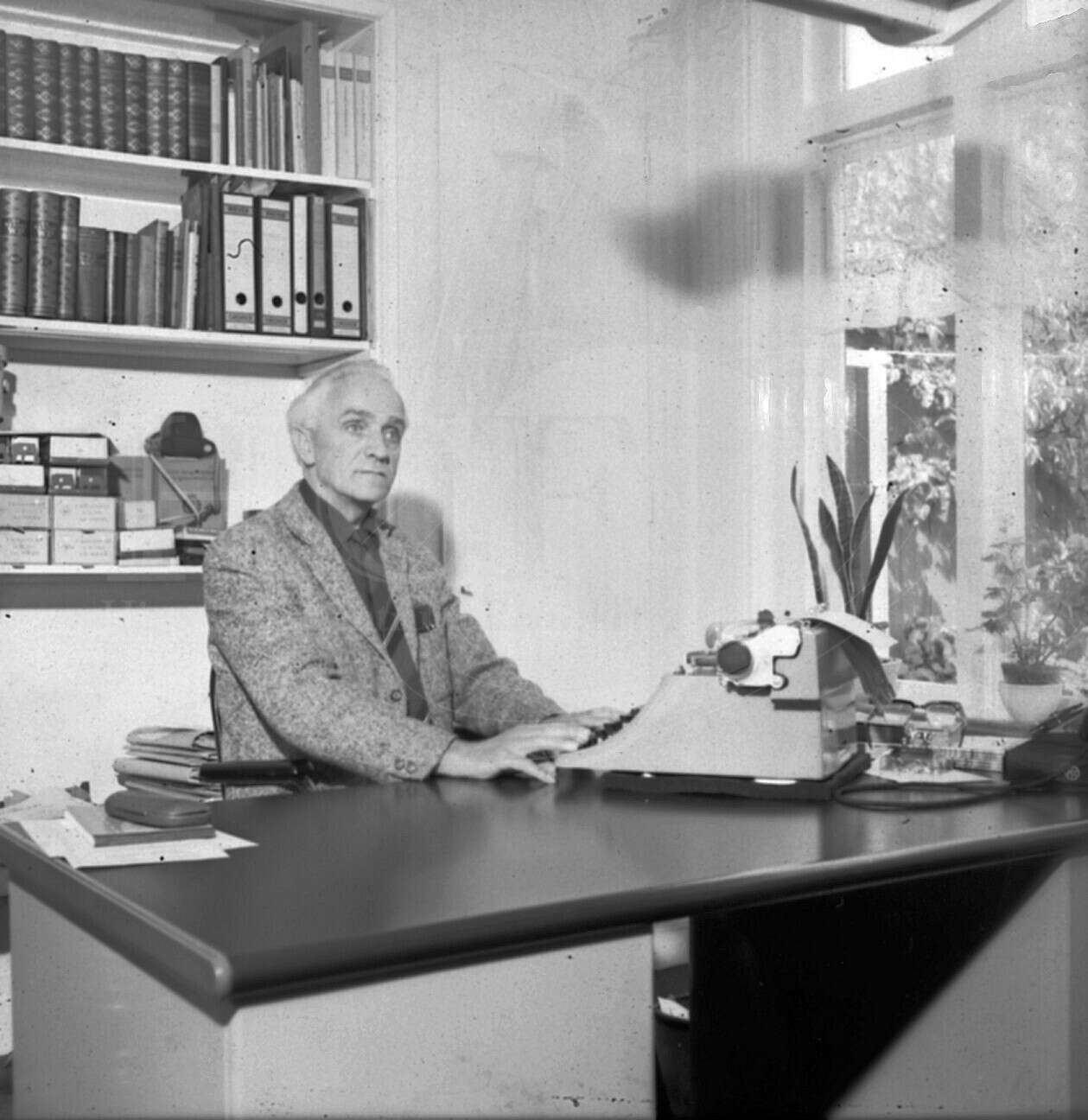 | Beschrijving: | Cornelis Roersma achter zijn typmachine |