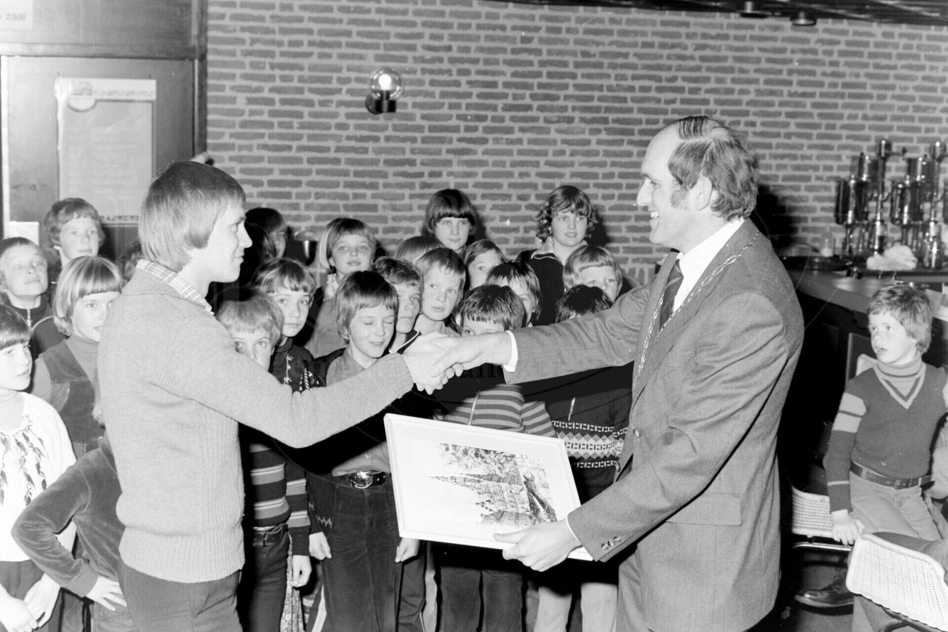 | Beschrijving: | Burgemeester Pop overhandigd een tekening van het stadhuis aan een man kinderen kijken toe. Waarschijnlijk in de Koornbeuurs. |