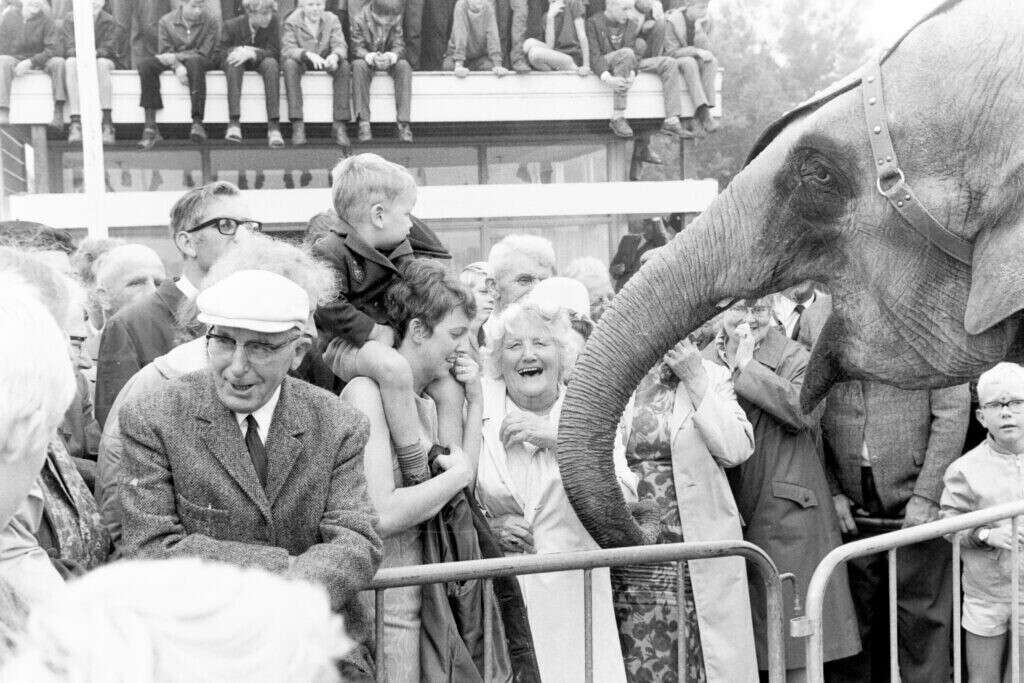 | Beschrijving: | Opening van de Rondweg (Burgemeester J. Dijkstraweg) tijdens het Froonacker 4 feest (F4) tijdens de Agrarisch dagen (maandag 15 t/m zaterdag 20 september). De opening werd vericht door commisaris der Koningin in Friesland mr. H.P. Linthorst Homan bijgestaan door 2 olifanten van het circus Rancy die 2 balken van de weg haalden. De aanleg van de rondweg, inclusieg grondaankoop, bruggen en tunneltjes, riolering en verlichting een slordige 5,4 miljoen gulden gekost. De weg is ruim 2,7 kilometer lang met 2keer 2 rijbanen. dit trace is 800 meter langer dan door de stad |