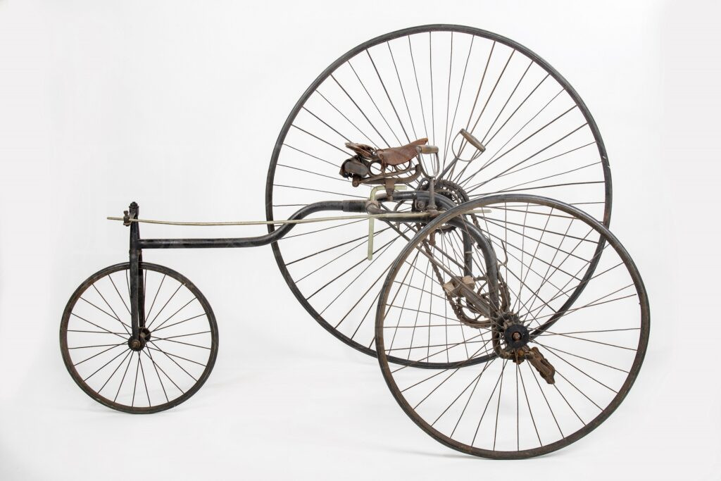 | Beschrijving: | "Tijdvak 1880-1890: veiligheidswieler en damesfiets (ca.) 1880 - driewieler. Representeert: vroege pogingen om iets aan de onstabiliteit van de hoge bi te doen door het toevoegen van een derde wiel tegen 'omvallen' Driewieler met kettingaandrijving, met drie wielen van ongelijke grootte, model “Open Head 1-2-3 Tricycle” gebouwd door de Engelse firma Bayliss & Thomas, ca. 1880;" |