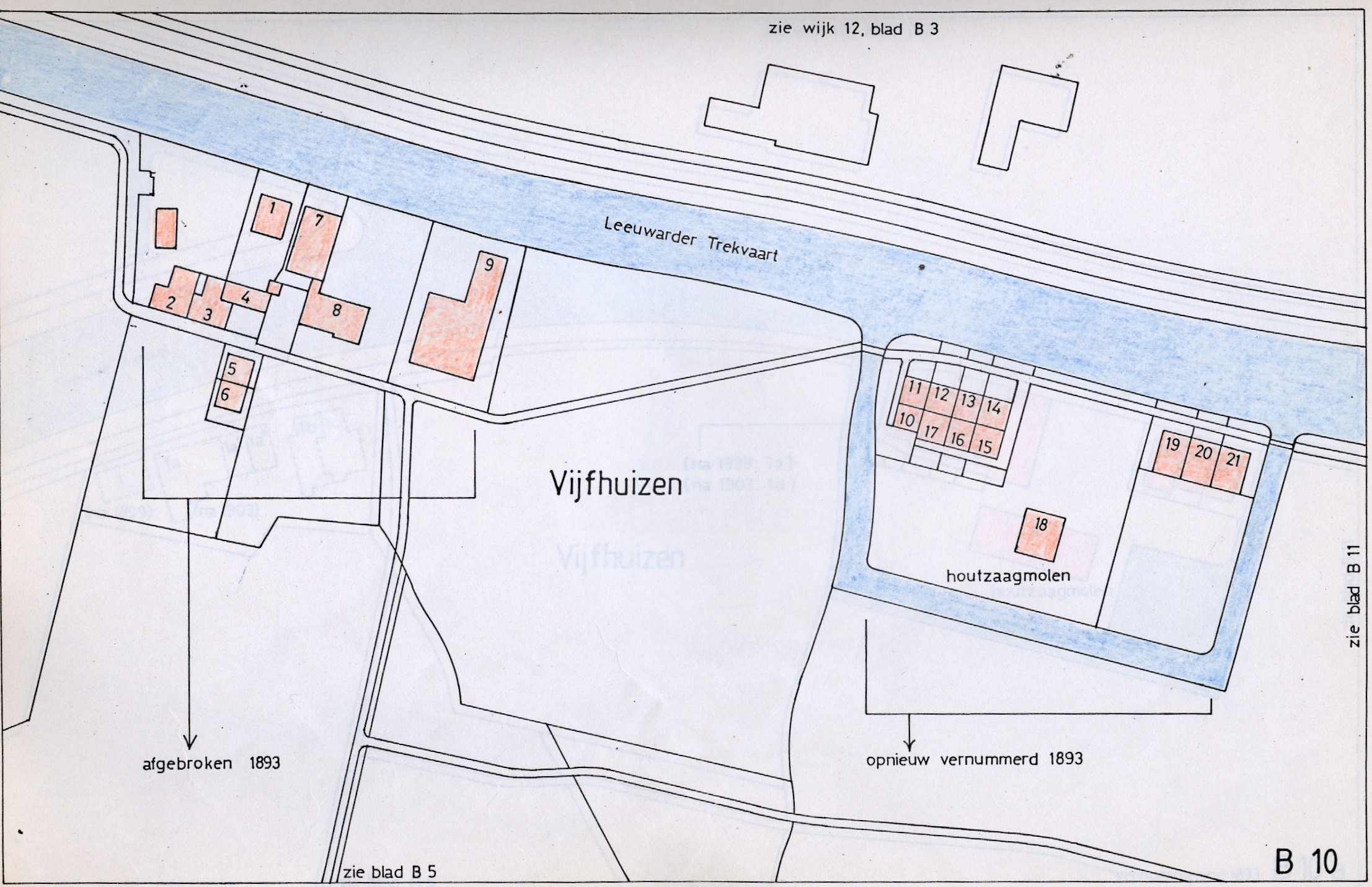 | Beschrijving: | Vijfhuizen met de huizen die moesten worden afgebroken voor de aftakking van het Kanaal |