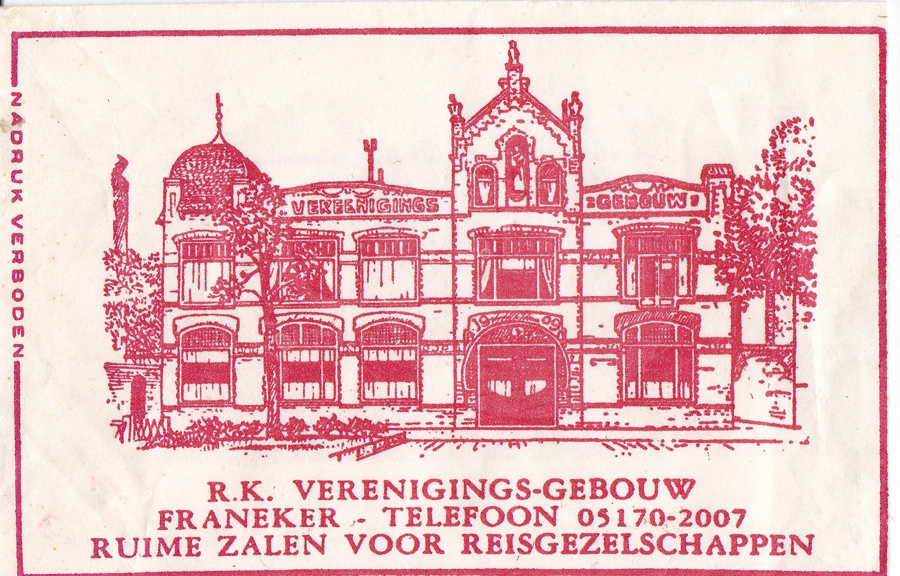| Beschrijving: | RK. Verenigings-gebouw Franeker Telefoon 15170-2007 Ruime zalen voor reisgezelschapen (Rood) ( Achterzijde: Geraffineerde Kristalsuiker W. v Van Oordt & Co Rotterdam Telefoon 56500) |