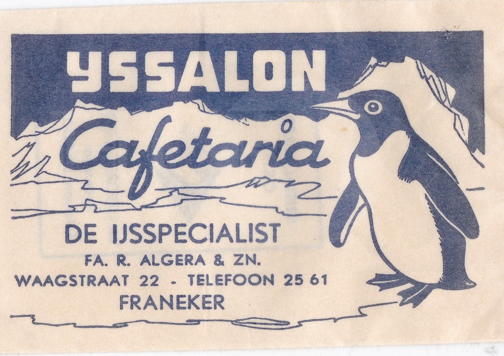 | Beschrijving: | IJSSALON Cafetaria ,,DE IJS SPECIALIST" Fa. R. Algera & Zn. Waagstraat 22 - telefoon 2561 Franeker ( Achterzijde: Kristasuiker C.S.M. W. v Van Oordt & Co Rotterdam.) |