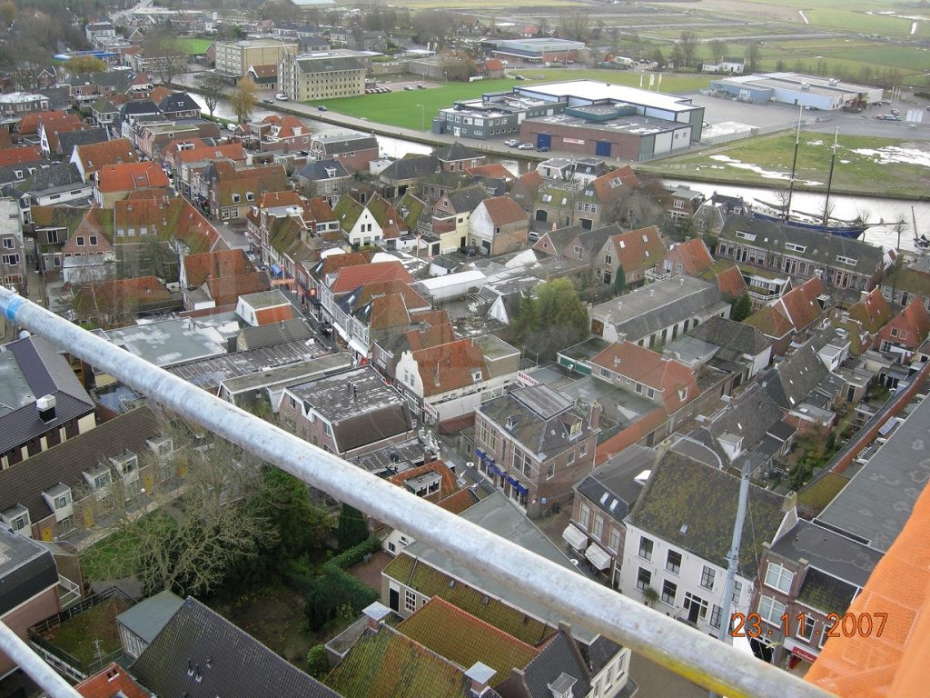 | Beschrijving: | Franeker in vogelvlucht. Uitzicht vanaf de Martinikerk Dijkstraat en Prins Hendrikkade |