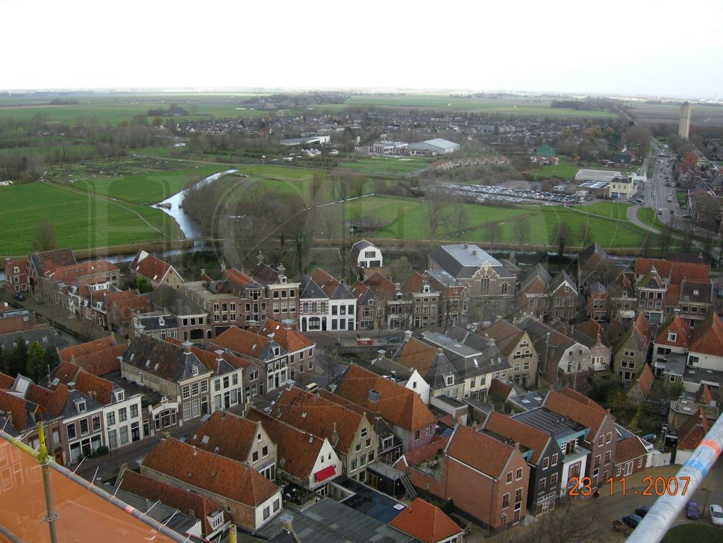 Beschrijving:Franeker in vogelvlucht. Uitzicht vanaf de Martinikerk Bloemketerp en Schalsumerplan