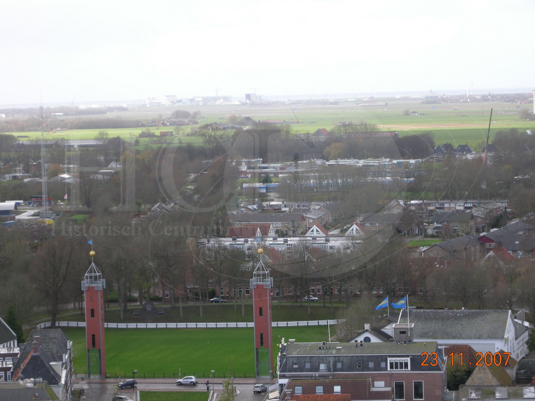 Beschrijving:Franeker in vogelvlucht. Uitzicht vanaf de Martinikerk Sjûkelân of Sternse Slotland en Lankum