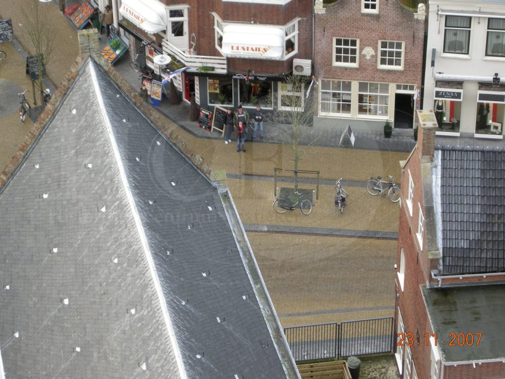 Beschrijving:Franeker in vogelvlucht. Uitzicht vanaf de Martinikerk richting Voorstraat 4