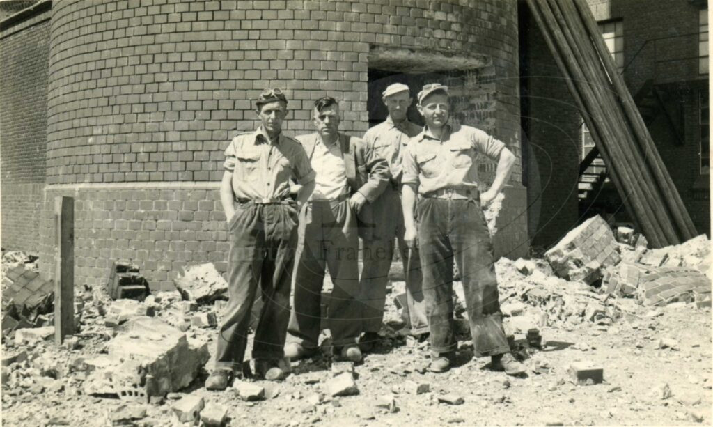 Beschrijving:vier werkmannen bij de afbraak van een schoorsteen.
