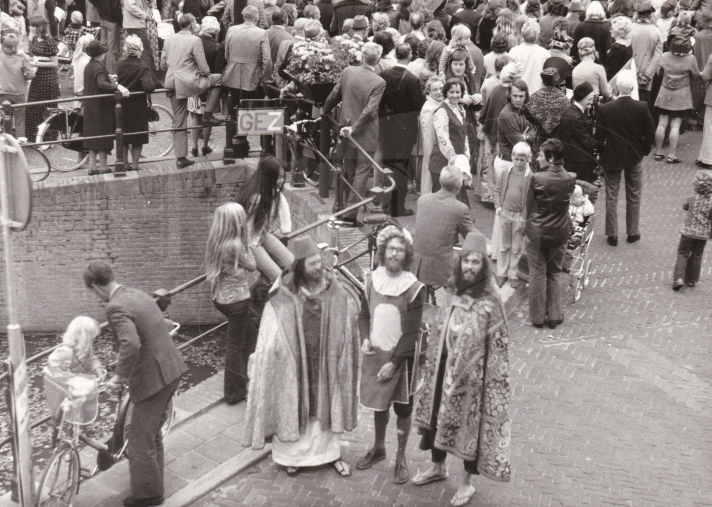 Beschrijving: | Feest. 775 jaar stad Franeker, de menigte wacht op De Profesoren het die uit Raadhuis gaan komen. . Ze gaan in optocht naar het Sjûkelân of Sternse Slotland voor de opening van de F4 Feesten tijdens de Agrarisch dagen. Deze drie wijzen uit het Oosten wachten ook. |