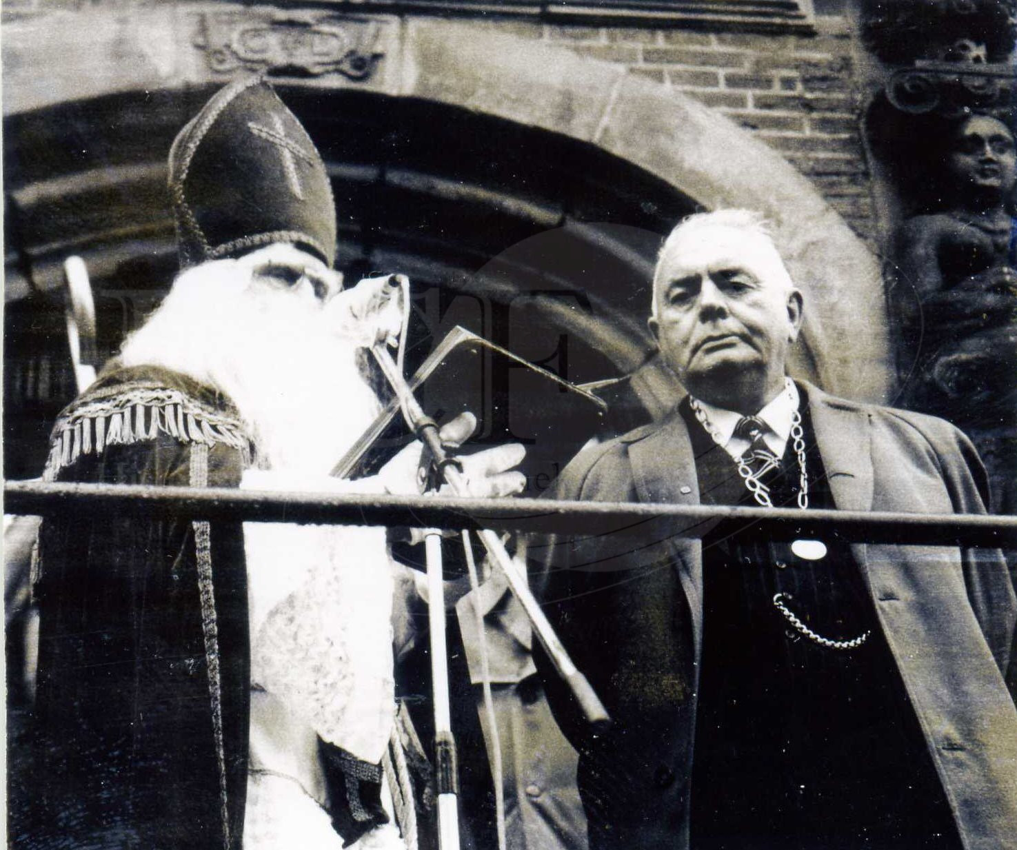 Beschrijving: | Sinterklaas houd een toespraak op het bordes. Burgemeester Jan Dijkstra luistert. |